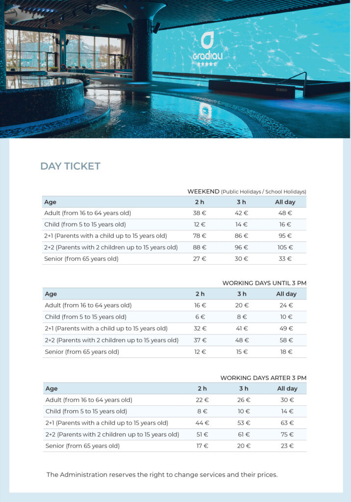 You can rent the VIP zone area in the Gradiali pool and sauna zone for your private event or exclusive evening. Price – €220/3 hours (+pool and sauna area tickets).