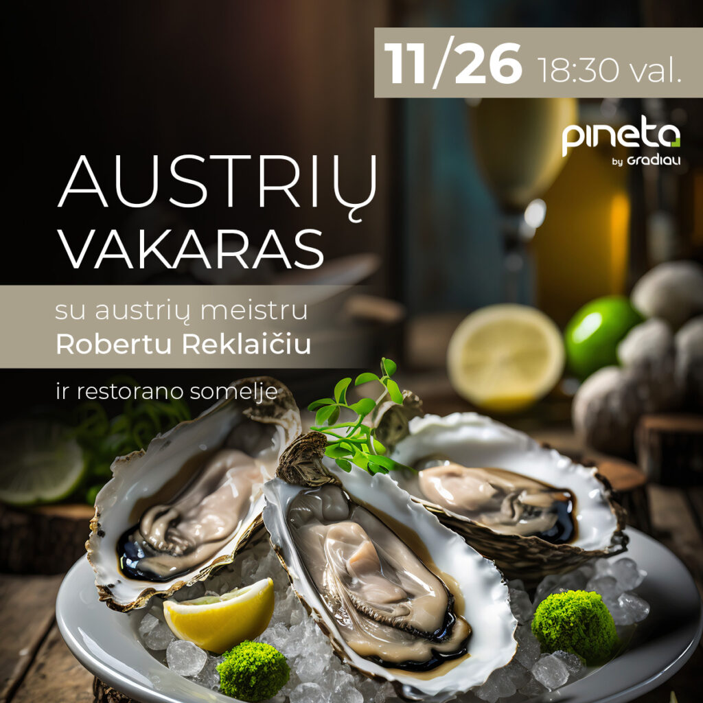 Trečiadienis 18:30 26 lapkričio Austrių vakaras | Palanga Paskelbta: 26 lapkričio, 2024 Skaityti plačiau Restoranas Pineta | Vanagupės g. 15, Palanga