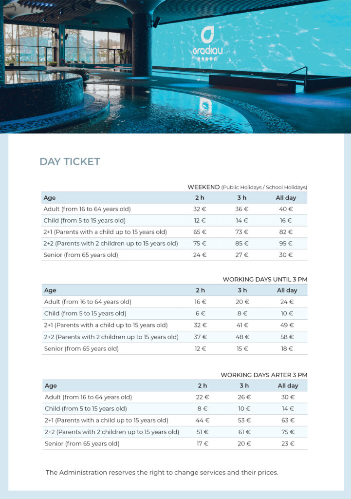 Weekend prices for the pools and sauna area apply from Friday at 3:00 PM.