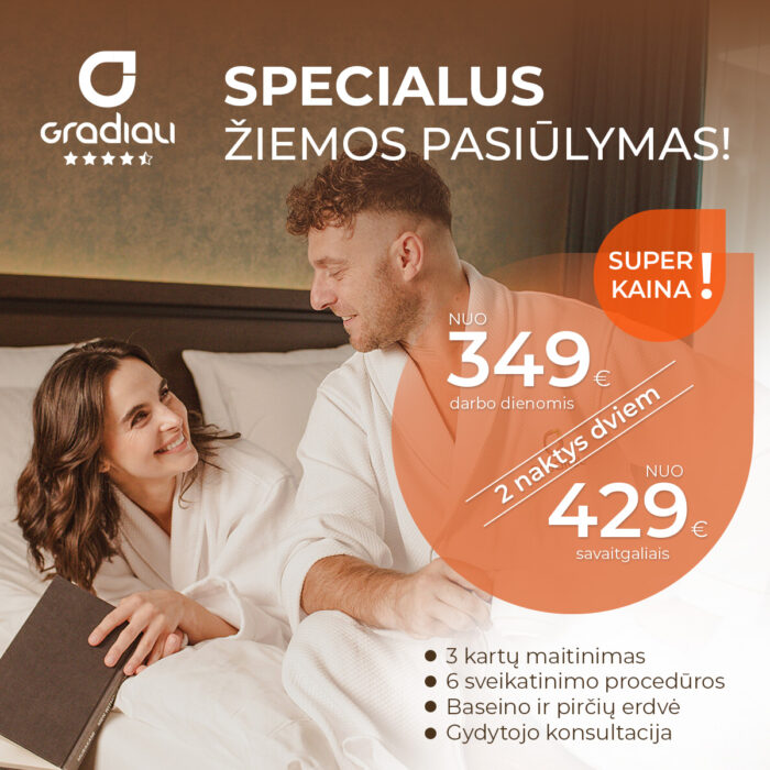 Specialus Žiemos pasiūlymas Gradiali Palangoje – sveikatinantis poilsis ramybės sezonu. Pasinaudokite šiuo pasiūlymu ir mėgaukitės poilsiu vos nuo 349 Eur. dviems (darbo dienomis) / 429 Eur. (savaitgaliais)!