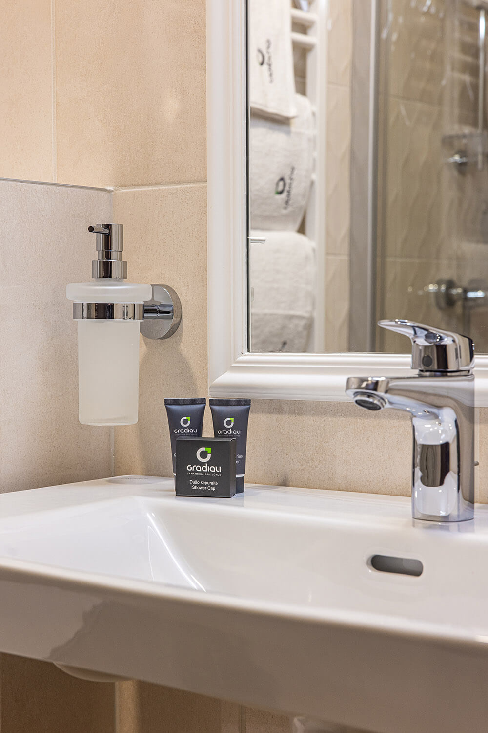Семейный номер состоит из двух отдельных спален с большими двуспальными кроватями (по запросу могут быть разделены на две отдельные кровати). В каждой комнате установлен широкоэкранный телевизор, сейф, балкон с отдельными входами и удобной для улицы приспособленной мебелью. Рядом с каждой комнатой установлены отдельные платяные шкафы, отдельные ванные комнаты с всеми необходимыми принадлежностями (гель для душа, шампунь, фен), мягкими халатами, полотенцами и тапочками.